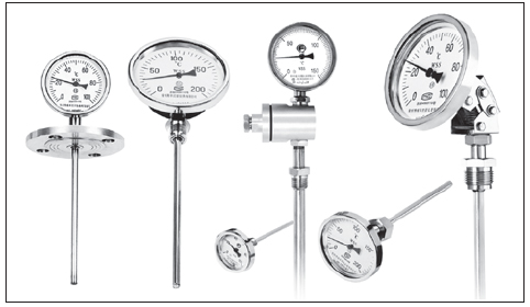 双金属温度计(以下简称温度计)是用绕成螺旋形的热双金属片作感温元件,并将它装在保护套内,一端固定(固定端),另一端(自由端)连接在一根细轴上,轴端装有指针。当温度发生变化时,感温元件的自由端随即 转动,通过细轴带动指针,在标度盘上指示出温度的变化;直型温度计则通过转向传动机构带动指针。表壳材料有 钢板、铸铝合金、不锈钢板。可调角型温度计的表头部份借助于波纹管,转角机构等零件,可以由角型到直型或从 直型到角型任意角度调整。