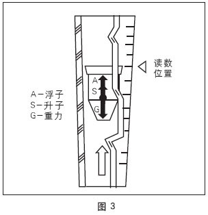 当升力S与浮力A之和等于浮子自身重力G时,浮子处于平衡,稳定在某一高度位置上,锥管上的刻度指示流体的流量值。如下图(图3)。