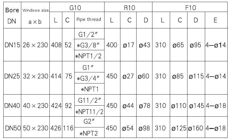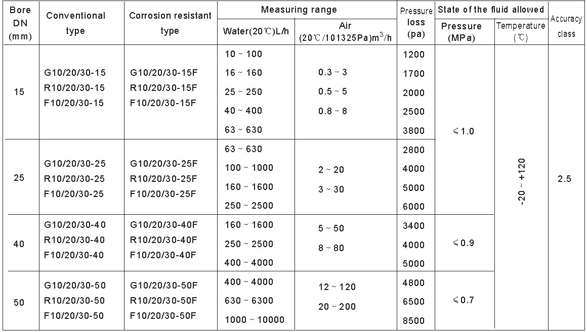 G/R/F10, 20, 30 glass tube rotameter has three types of connection: pipe thread (G10 type), hose pipe (R10 type) and flange ( F10 type). Its maximal working pressure and maximalworking temperature are higher than other glass tube rotameters with the same bore. It's divided into normal type (Measuring general noncorrosive fluid) and corrosion resistant type (Measuring corrosive fluid.). The meter is featured with compactness, light structure, nice looking, convenient maintenance, safe and reliability, easy installation.The flange of F10 type can rotate to be aligned with the pipe holes on the spot vessel.