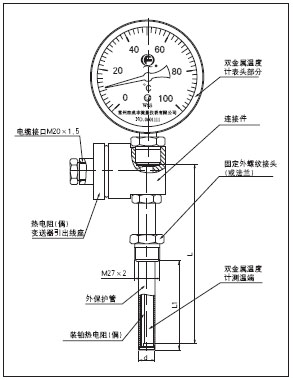 Bimetallic indication thermal resistance (thermocouple) is an integration temperature measurement instrument with on site indication and remote transmission display function.It can be used directly to measure the temperature of gasses、liquids and substances. The indication value can be read distinctly on site.And the signals can be transmitted to the control room.The transmitted signals include Pt 100,K type and E type thermal resistance signals,also the (4~20)mA standard signal after transmission. It plays a role as an instrument with two functions |